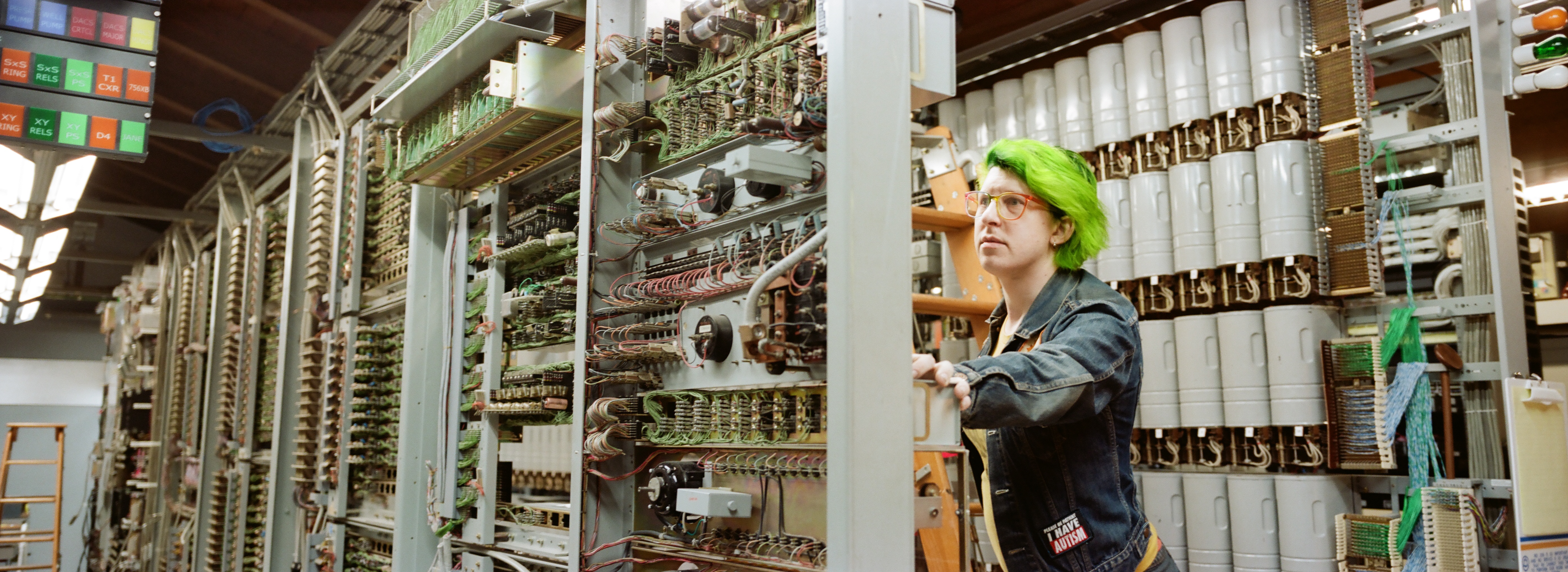 Seattle volunteer and board member Sarah Autumn working on step-by-step equipment in the switchroom of the "JKL" American Museum of Telephony in Santa Cruz, California. Photograph by Claire Violet.